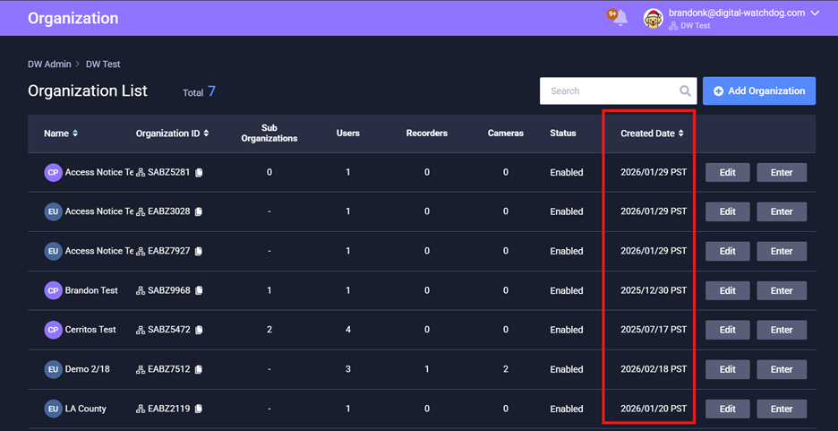 These columns allow users to sort organizations and recorders chronologically, making it easier to locate recently added systems and manage large deployments.