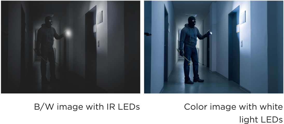 Create deterrence and provide crystal-clear images in color without the need for external illumination or the potential loss of color and detail from B/W images.